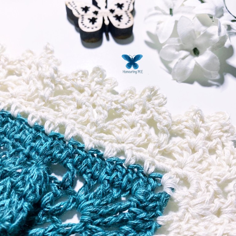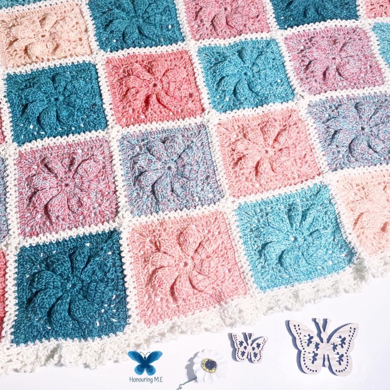 And then of course there was the border! This one I reached out to my network for help with. I chose four from a book and ended up using the most popular one for it. And everyone chose well! The book is Around the Corner Crochet Borders and is a very handy book to have in your library. It also has written instructions, charts and a finished example for each border. I chose a bigger border than usual as I wanted to balance out the size of the join and the squares.