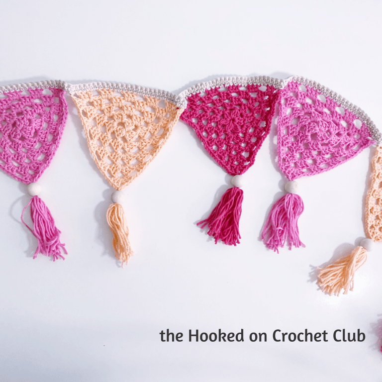 I needed something to brighten up a room divider that I purchased which is all white and needed something to break it up. The triangles were patterns from my Hooked on Crochet Club and rather than have them made for no purpose, it seemed right to turn them into a bunting!