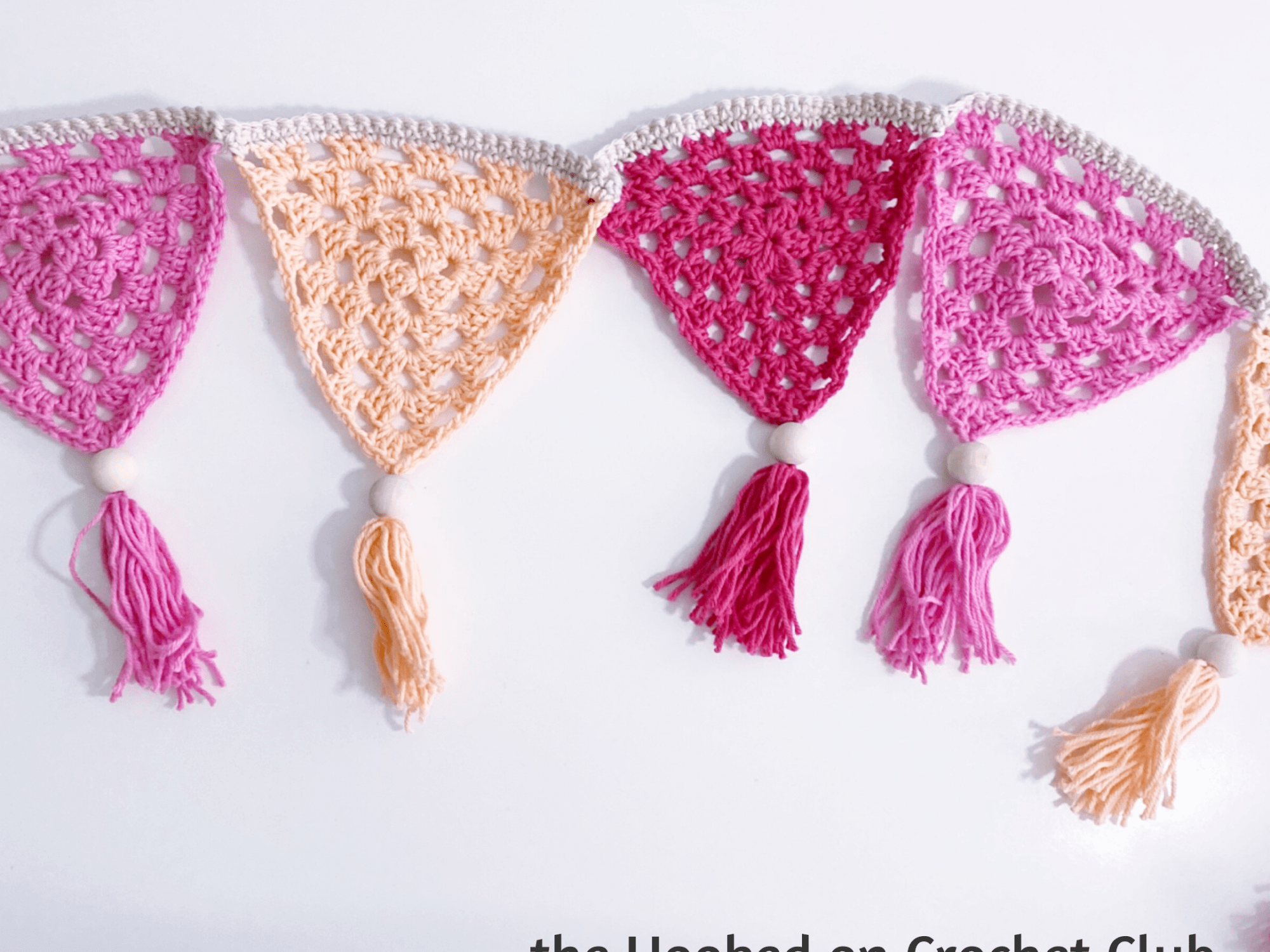 I needed something to brighten up a room divider that I purchased which is all white and needed something to break it up. The triangles were patterns from my Hooked on Crochet Club and rather than have them made for no purpose, it seemed right to turn them into a bunting!