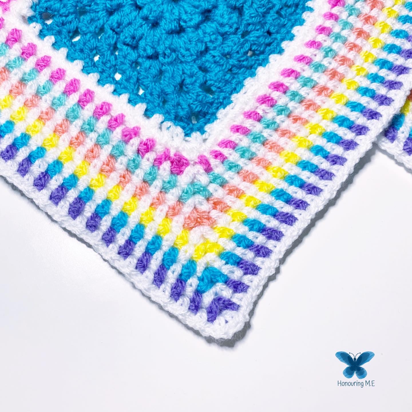 This first border is using the moss stitch. I love this border as it doesn’t require much in the way of math. And because the foundation round needs to be an even number, it is easy to fudge if your count is out by one. I also love that it is so simple, and can be made to look different every time just by switching up your colour combos. And you can make it what ever number of rounds that you want. Once the foundation round and the first round is complete, it’s all easy from there.