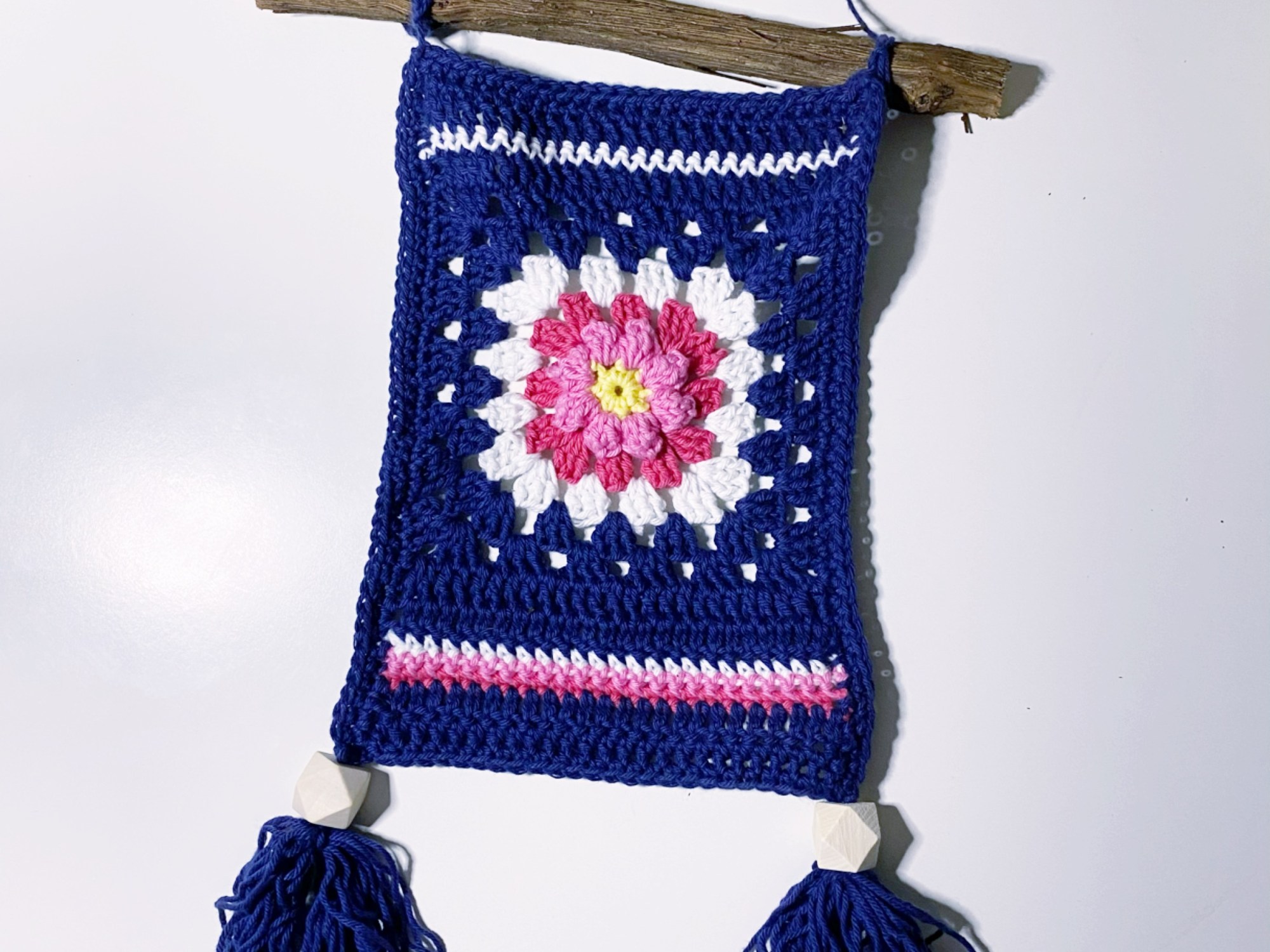 This one is a favourite too and hangs on the wall in my clubhouse! I made a square, added rows to the top and bottom. Then added a border, some tassles and attached it a stick. You can check out the reel for it here.