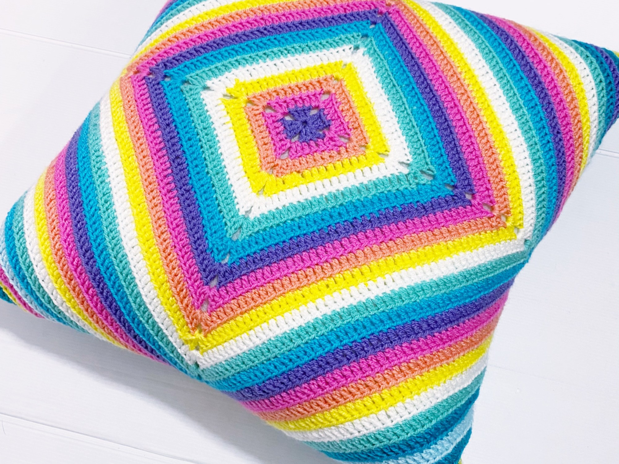 I’ve used yarn from my stash – in this case it was Scheepjes Colour Crafter – which had been left over from a couple of different projects. I didn’t have enough of each colour to be able to continue the colour combo all the way through, but the final rounds go to the back of the cushion so I made it work as best I could.