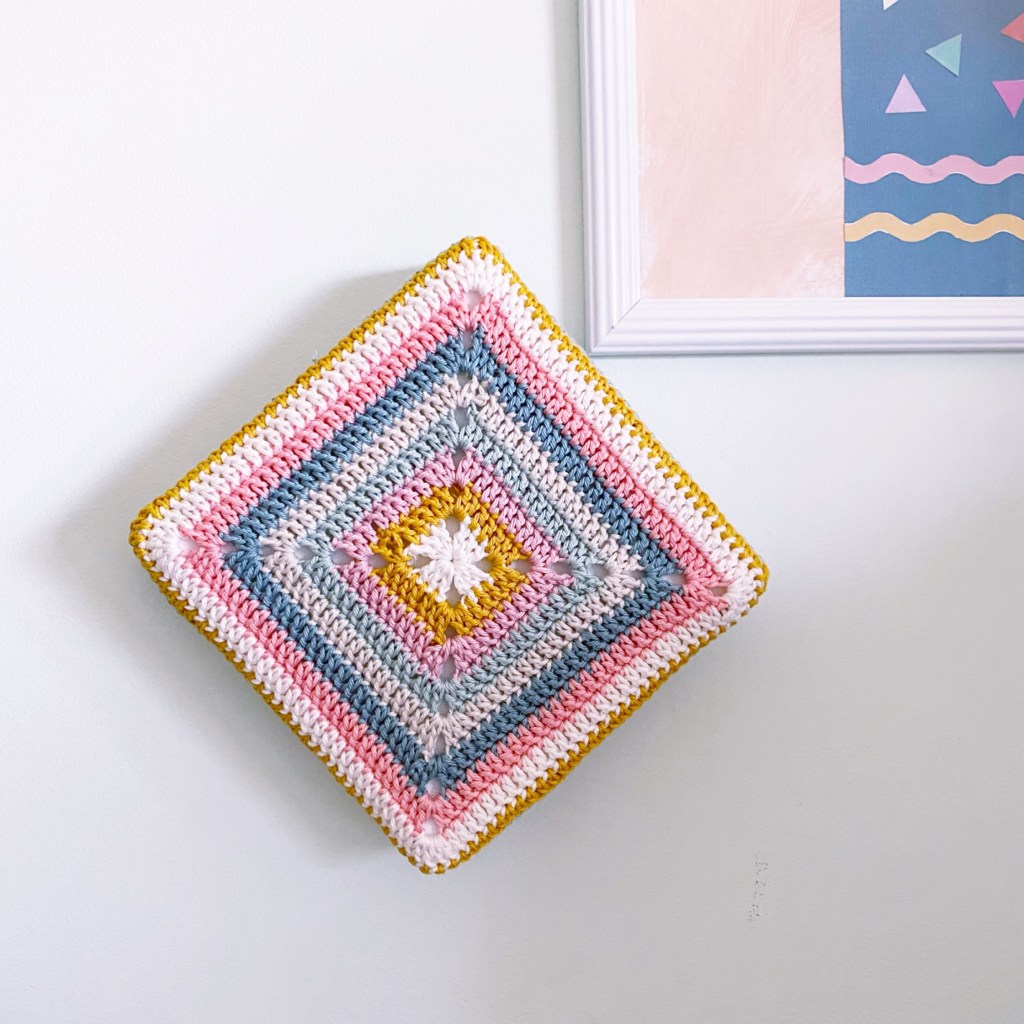 I made mine from a traditional solid granny square and some Scheepjes Catona that was in my stash. This yarn is a 100% mercerised cotton so it has a lovely shine to it. The only other item you need (besides a hook) is a canvas block. I purchased a 6 inch square block from my local craft store.