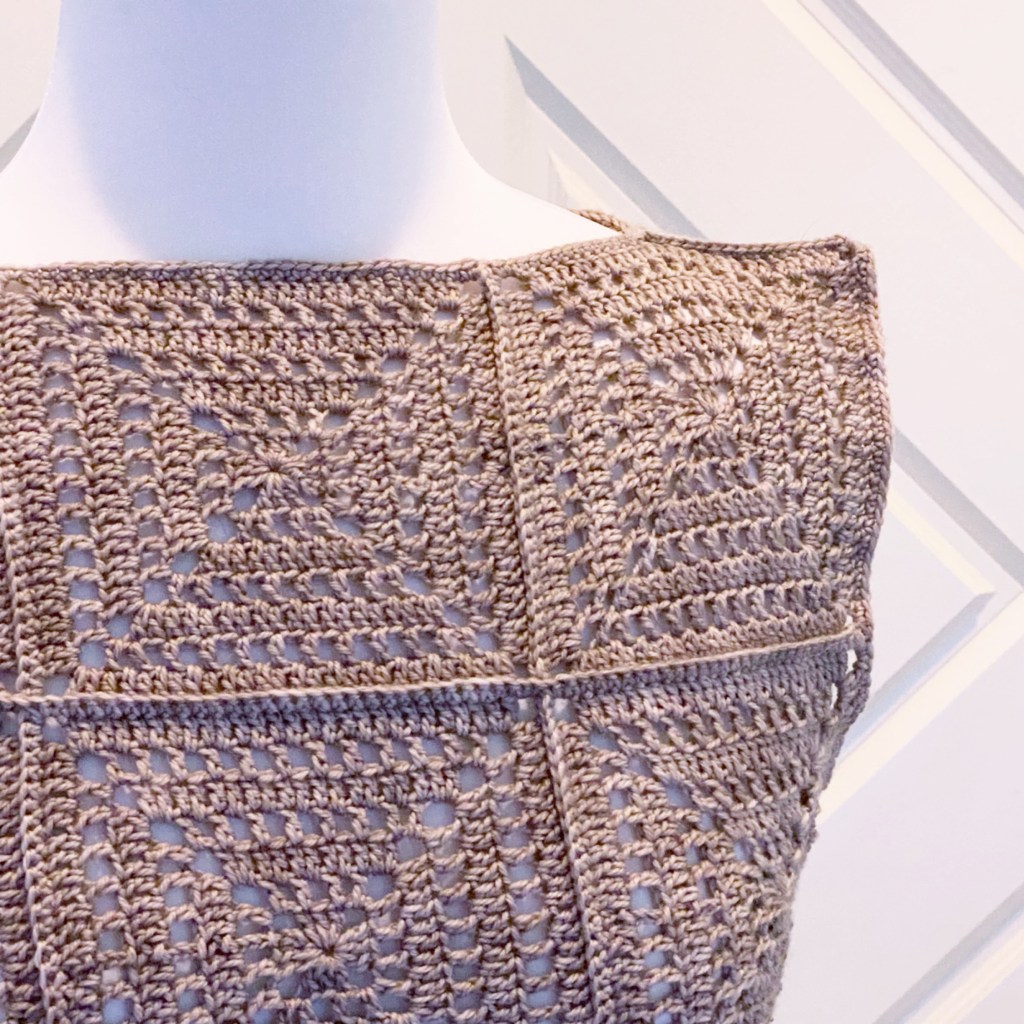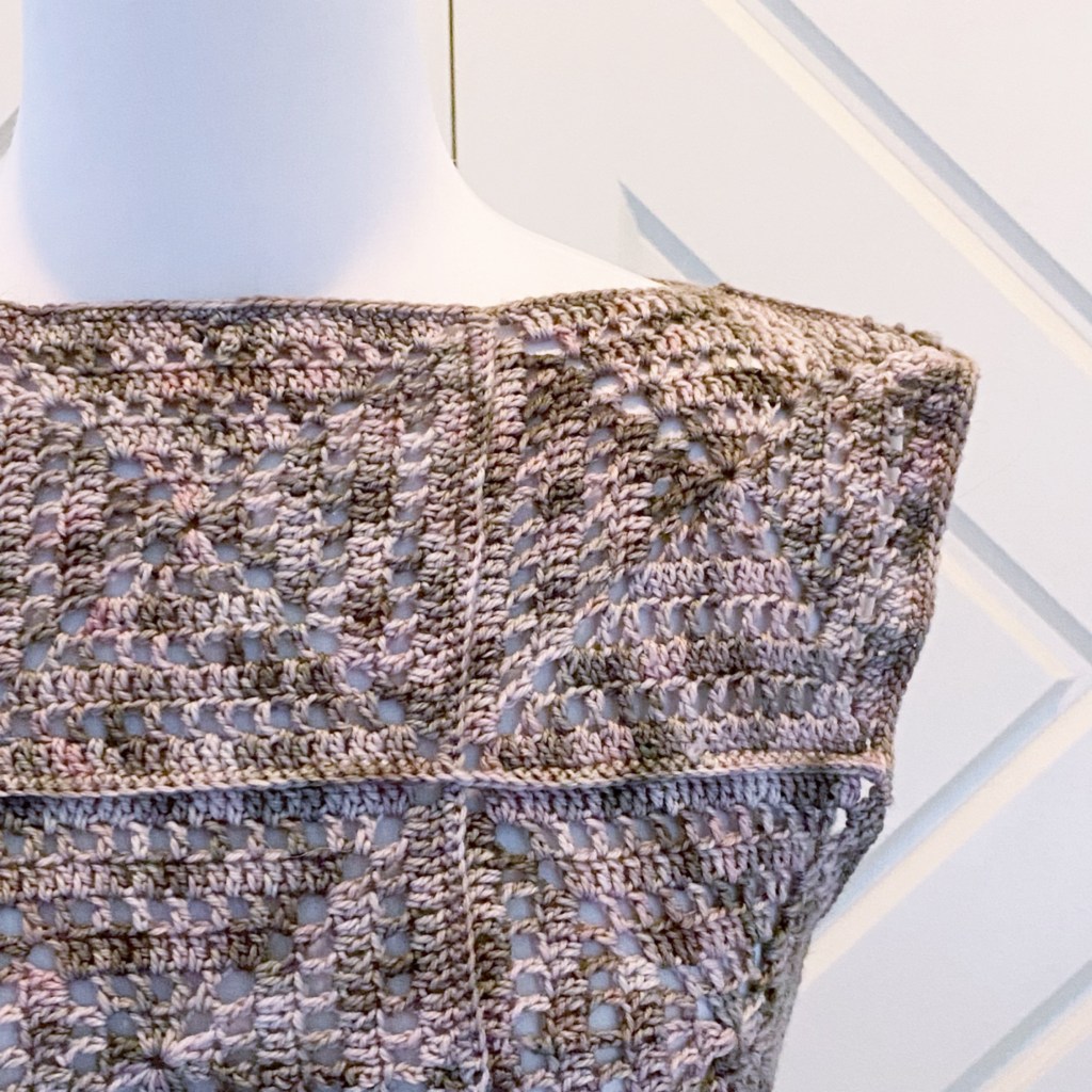 I joined all fo the squares and the sides, added a simple border around the arm and neck holes before working on the bottom band. This was to make sure that I had all of the yarn that I needed. This top and style is definitely going to be a favourite for me!