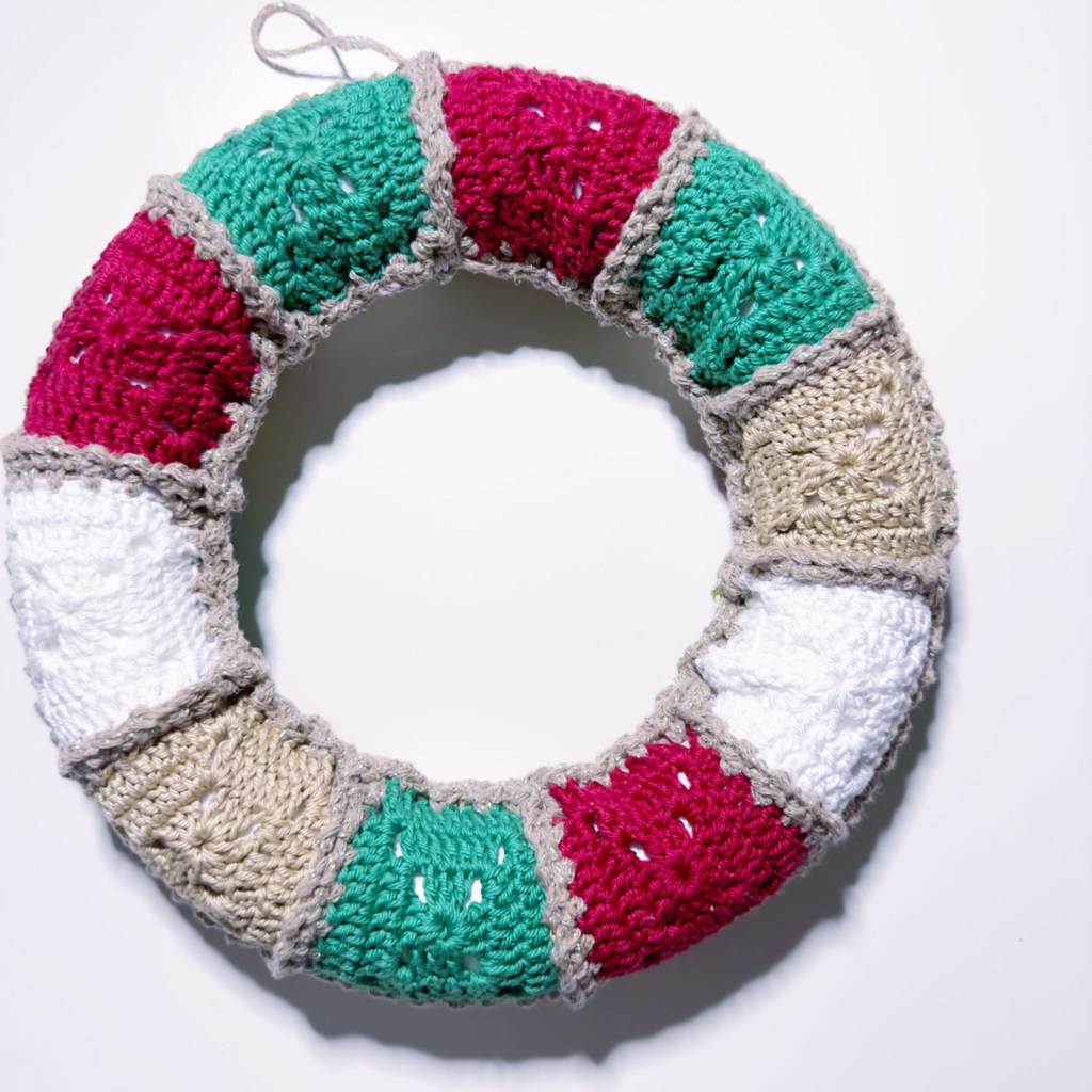 This one was made with a 4ply cotton and a 2.5mm hook. I wanted to keep the squares as dense as possible. I then joined with a sparkly yarn. The foam wreath underneath is approximately 23cm diameter total and the foam part is around 5cm thick. I considered getting my hot glue gun out, but didn’t need to as joining the squares and sewing them onto the wreath worked perfectly.