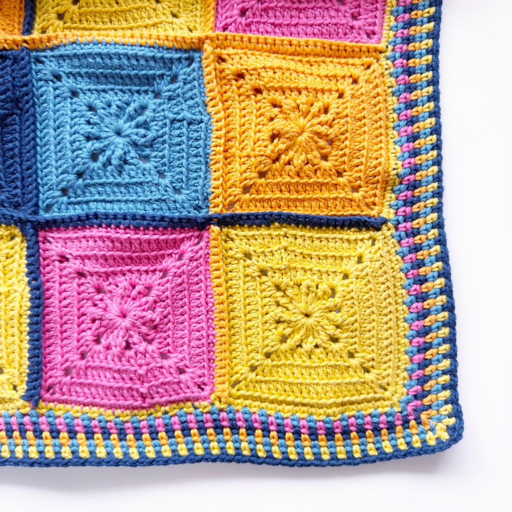 One thing I have noted with blankets made from squares is that if we’re not joining them with an invisible seam, then we’re joing them with a neutral or single colour that matches in with the rest of the blanket. If you’re doing a stash busting blanket then this often means having to purchase yarn to join with which kind of defeats the purpose of trying to use up yarn in your stash. So I decided to experiment a little with this blanket and joined with different colours for every join.