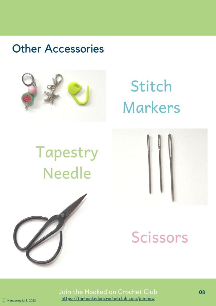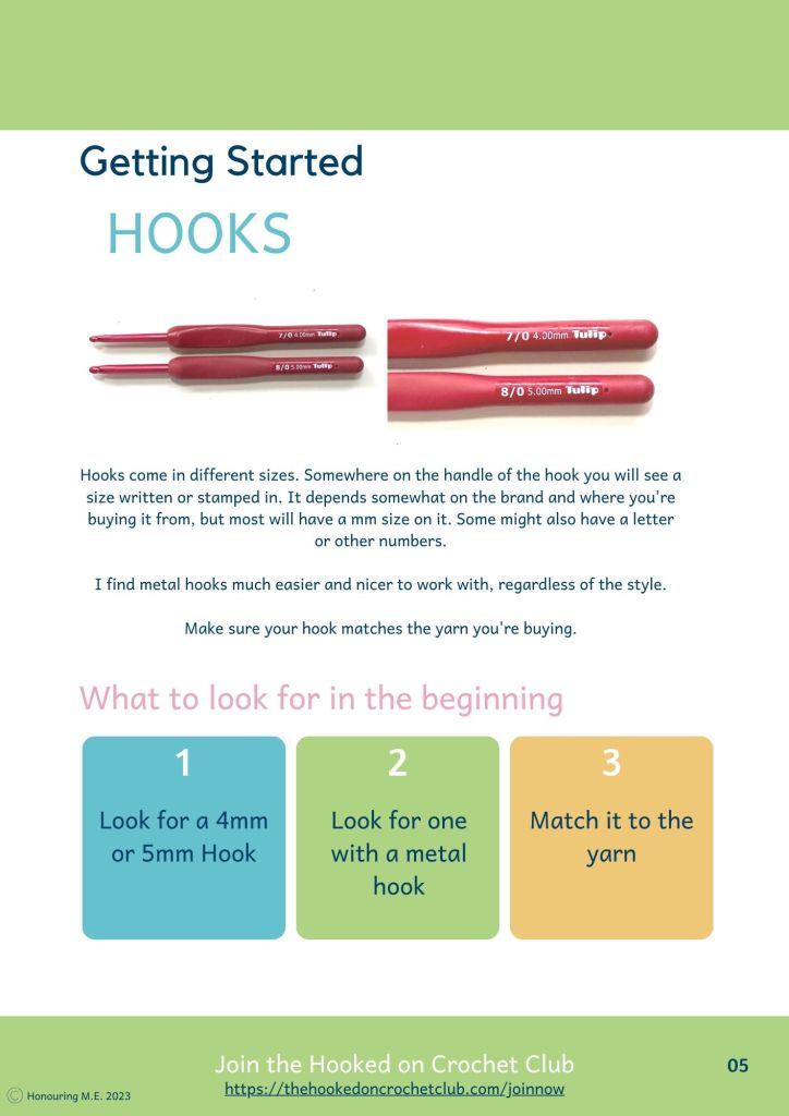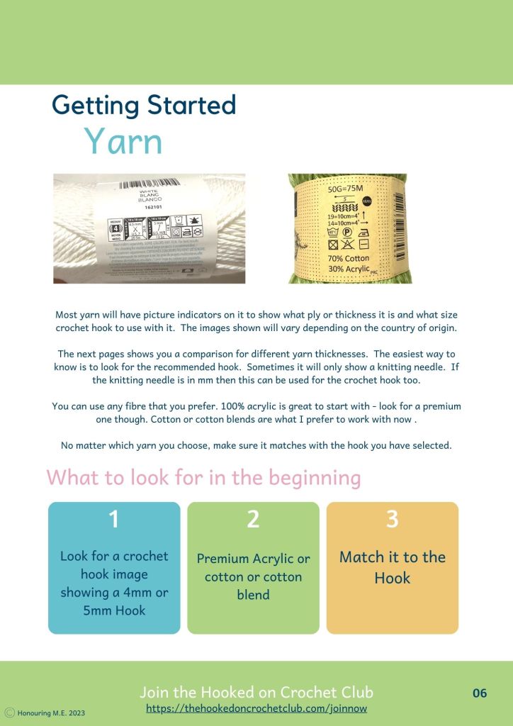 If you’ve started to look then you’ll know that there are a huge range of hooks and yarns to buy. And they come in so many different sizes and styles that it is easier to just give up than commit to buying and then find out you chose wrong. Below I have copied in some of the pages from my Free Crochet Beginners guide. This guide shares not only the tools, but the steps you should take to learning the stitches too. Click on any of the images or scroll to the end and you can download it for free.
