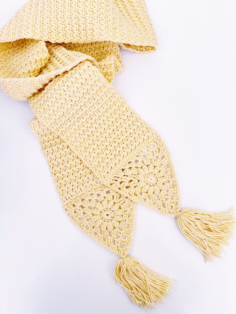 I’ve created this with 200g of a cotton yarn. I began by making the squares and tassles – or in this case triangles! – and then used the remaining yarn to create a scarf. The traingles were attached at each end to jazz it all up a bit. The first triangle I used as the foundation for the scarf by crocheting on one side. The second one I attached once I had the length. You can always attached both at the end, but just be sure to get width of the side that you’re attaching to match the width of the scarf.