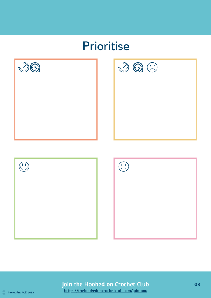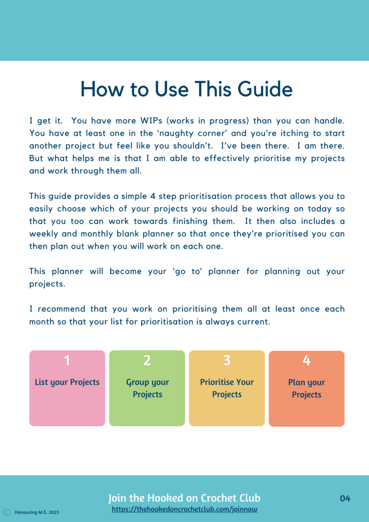 If you need help prioritising your projects then I encourage you to get my WIP Planner. It will help you to list out all of your projects and prioritise (or frog) them. Below is a sneak peak to some of what is inside.